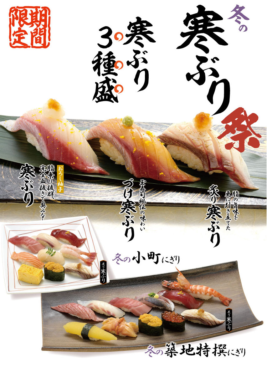 1月の限定入荷は「たらの白子軍艦(一般店のみ)」と「天然ふぐのにぎり」(食べ放題店のみ」