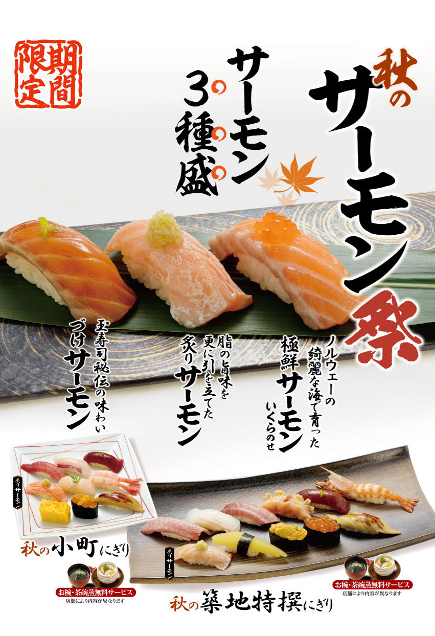 ※「すぎ」を加えたおきまり「夏の築地特撰にぎり」「夏の小町にぎり」(食べ放題店のみ)もご用意しております。